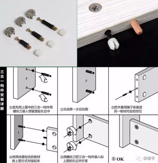 定制衣柜多用颗粒板,因为颗粒板用射钉连接不牢固,一般用“三合一连接件”进行连接固定板材。